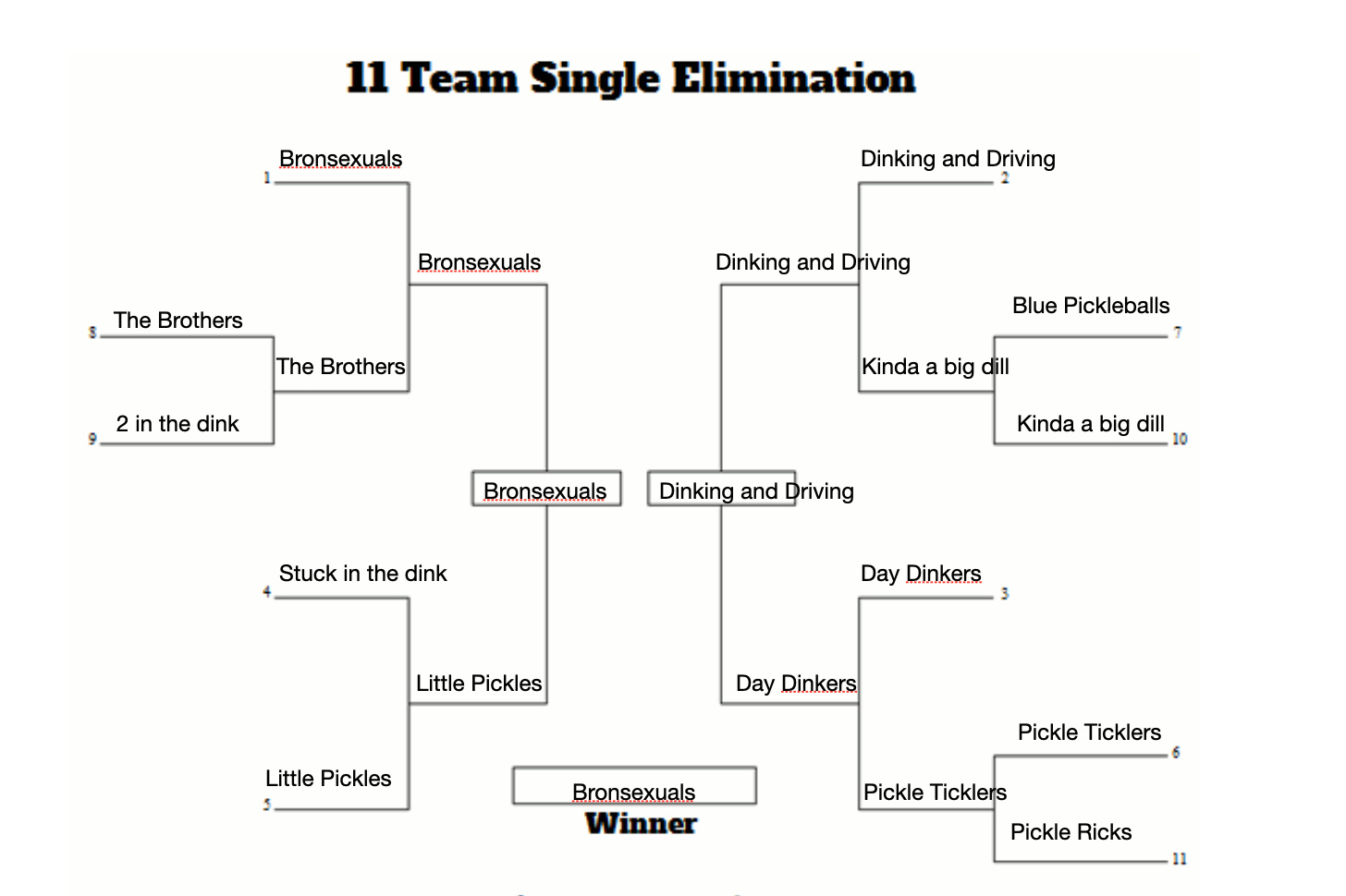 | Pickle Ticklers | Bronsexuals | 2-11, 4-11, 2-11 |