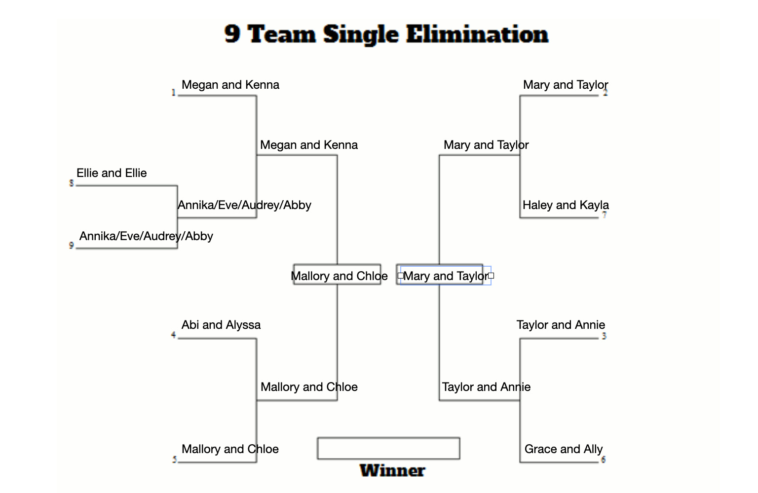 | Taylor and Annie | Annika / Eve / Audrey / Abby | 11-3, 11-8 |