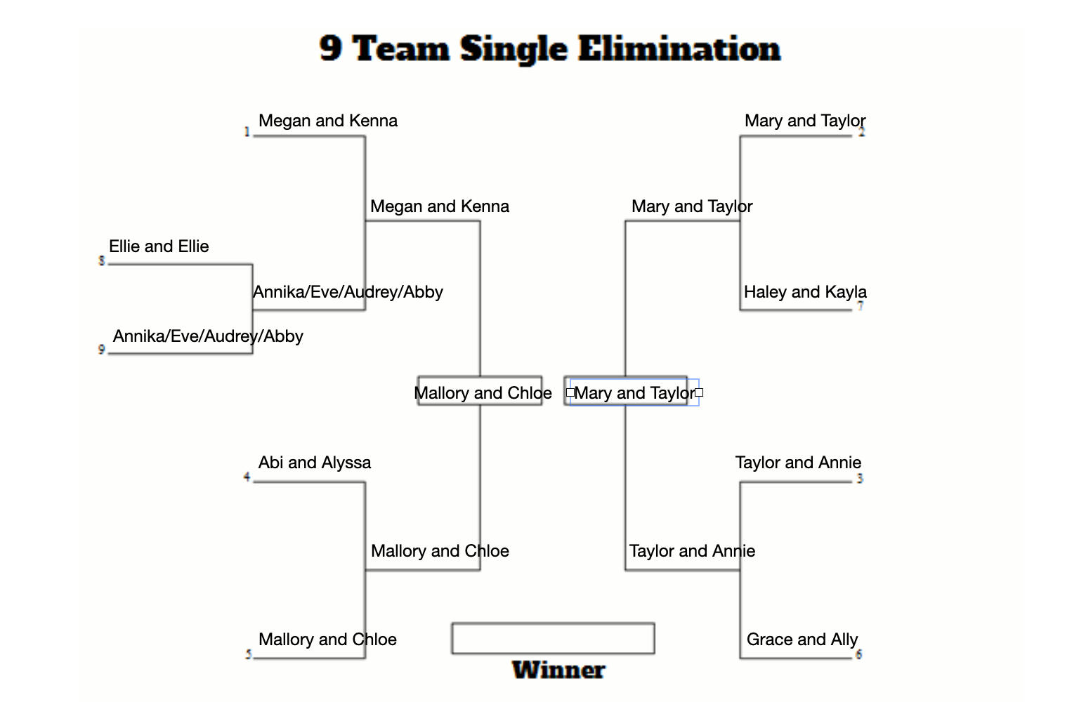 | Mary and Taylor | Megan and Kenna | 6-11, 9-11 |